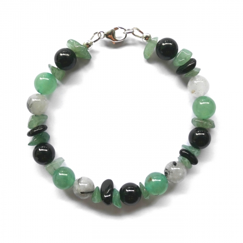Dieses Armband, mit den Steinen Aventurin, Schörl und Turmalinquarz, kann dabei helfen aus dem Wirrwar und Kreisen des Denkens zurück zu einem stabilen emotionalen Ausgangspunkt zu finden. Die Kombination von grünem Aventurin und Turmalin unterstützt dabei sich aus einem positiven Moment heraus selbst zu überwinden und bestärkt darin vom Denken zum Handeln überzugehen. Diesen Aspekt abrundend hilft Schörl den eingeschlagenen Weg konsequent weiter zu verfolgen.
