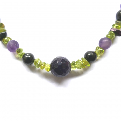 Die vorliegende Halskette soll, mit den Steinen Amethyst, Peridot, Schungit und Sugilith, seinen Träger bei dem Unterfangen einer Körperentgiftung unterstützen. Peridot, Amethyst und Schungit entgiften und reinigen das Blut und helfen dabei im Körper angesammelte Giftstoffe erfolgreich ausscheiden zu können. Schungit und Sugilith unterstützen in Kombination den Körper dabei sich tiefergehend von Krankheiten regenerieren und befreien zu können. Bitte beachten sie bei diesem Produkt besonders unseren Verbraucherhinweis.