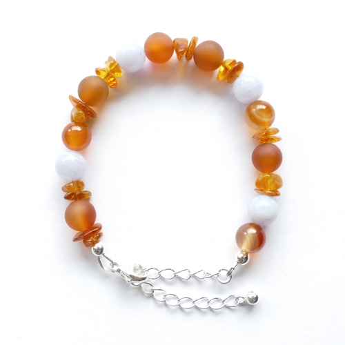 Dieses Armband, mit den Steinen Bernstein, Chalzedon und Karneol, bestärkt die innere Freude am Leben und die Bereitschaft sie mit anderen Menschen zu teilen. Chalzedon und Karneol stärken Redegewandtheit, Einfallsreichtum, Entschlusskraft und Tatkraft. Bernstein hilft Zuversicht und Geduld zu bewahren und sich nicht wegen Kleinigkeiten aus der Fassung bringen zu lassen. In Kombination helfen sie dabei den Fokus auf das Schöne im Leben zu richten.