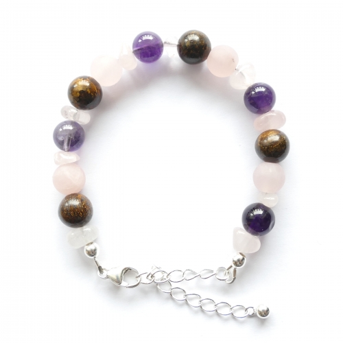 Dieses Armband soll Ihnen, mit den Steinen Amethyst, Bronzit und Rosenquarz, dabei helfen innere Aufstauungen abzubauen und zurück zur inneren Ruhe zu finden. Amethyst und Bronzit lösen dabei blockiertes Denken und tragen dazu bei angespannte Nerven zu entspannen. Rosenquarz unterstützt das Streben sich auf sich selbst zurück zu besinnen und darauf gründend zu einem inneren Moment der Ruhe zurückzukehren.